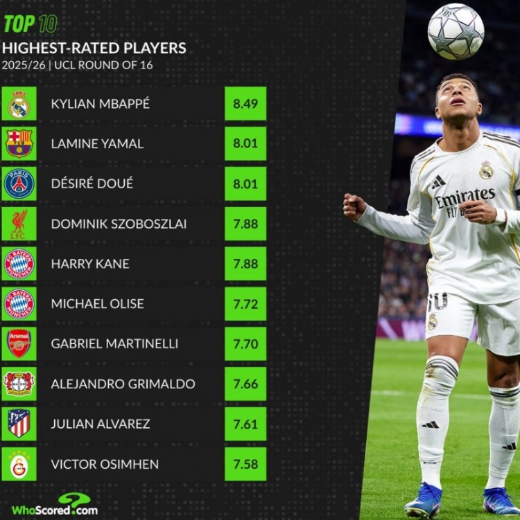 V站资讯-本赛季欧冠16强球员场均评分榜:姆巴佩居首,亚马尔、杜埃前三