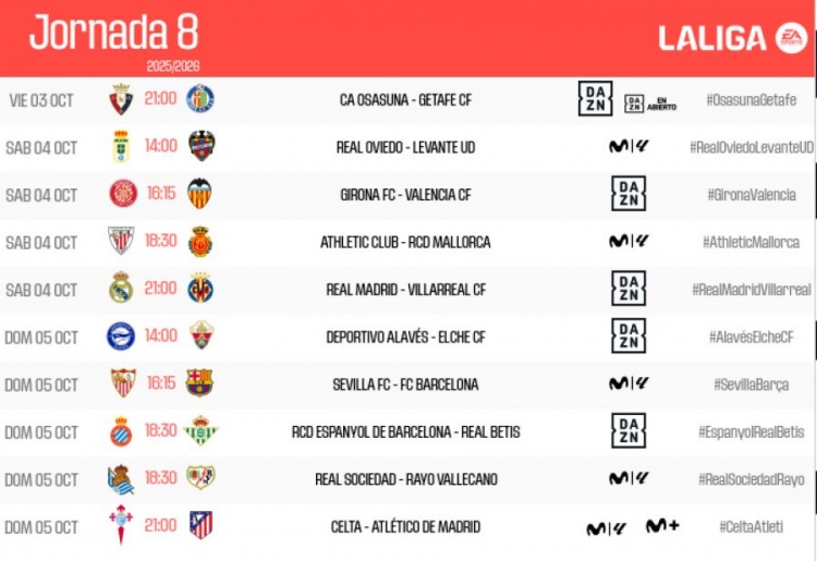 西甲联赛官方于本周一正式发布了本赛季第8轮比赛的详细时间安排,本轮赛事将从北京时间10月4日凌晨03:00持续进行至10月6日凌晨03:00。